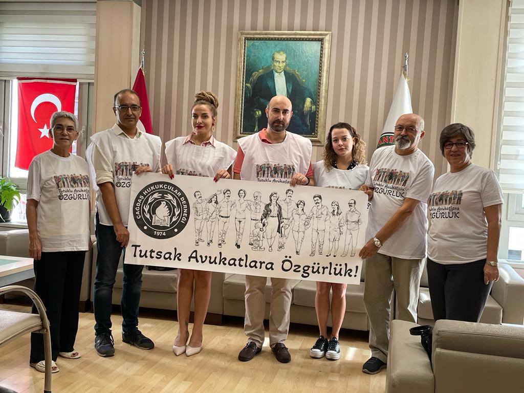 Çağdaş Hukukçular Derneği Antalya Şubesinden avukatlar da halkın avukatlarına verilen hükmün yıldönümünde özgürlük talebini bir kez daha dile getirmek için Antalya Adliyesi önünde bir eylem gerçekleştirdi.