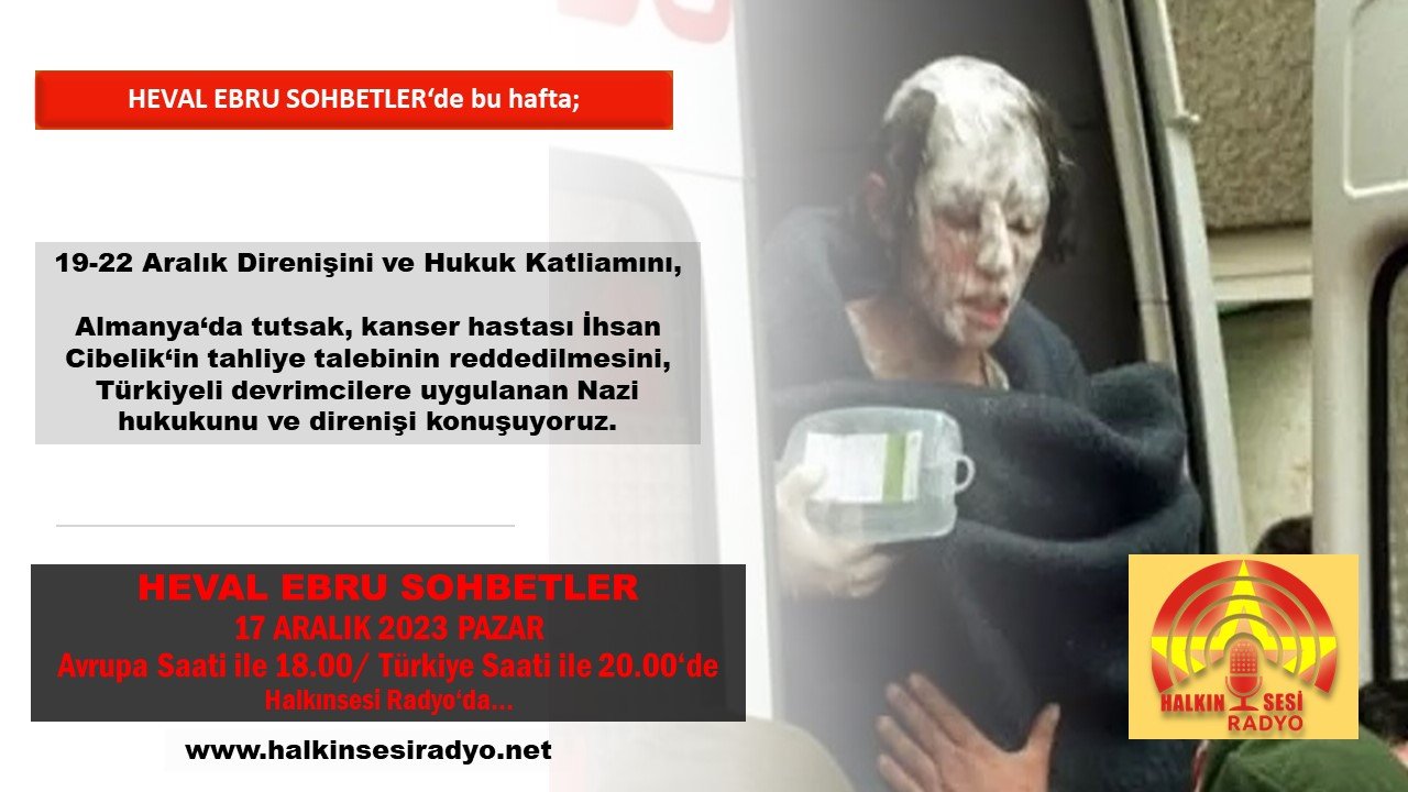 Heval Ebru Sohbetler programının 17 Aralık Pazar günü yayınlanan, 19-22 Aralık direnişi ve hukuk katliamlarının ele alındığı, ayrıca Almanya’da kanser hastası İhsan Cibelik’e karşı uygulanan Nazilerden kalma hukuk terörü ve Grup Yorum üyesi İhsan Cibelik’in sağlık hakkını gaspeden bu yasalara karşı direnen Süresiz Açlık Grevi direnişçilerinin konuşulduğu bölümün kaydını paylaşıyoruz.