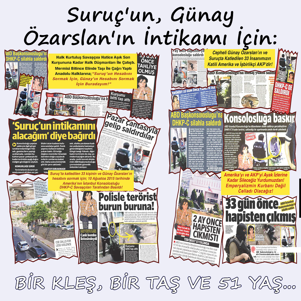 2- 10 Ağustos 2015 tarihinde Amerika’nın İstanbul Konsolosluğu taranmıştır. Eylemi gerçekleştiren savaşçılarımızdan Hatice Aşık son mermisine kadar halk düşmanları ile çatışmış ve kurşunları bittikten sonra da taşlarla direnerek tutsak düşmüştür…