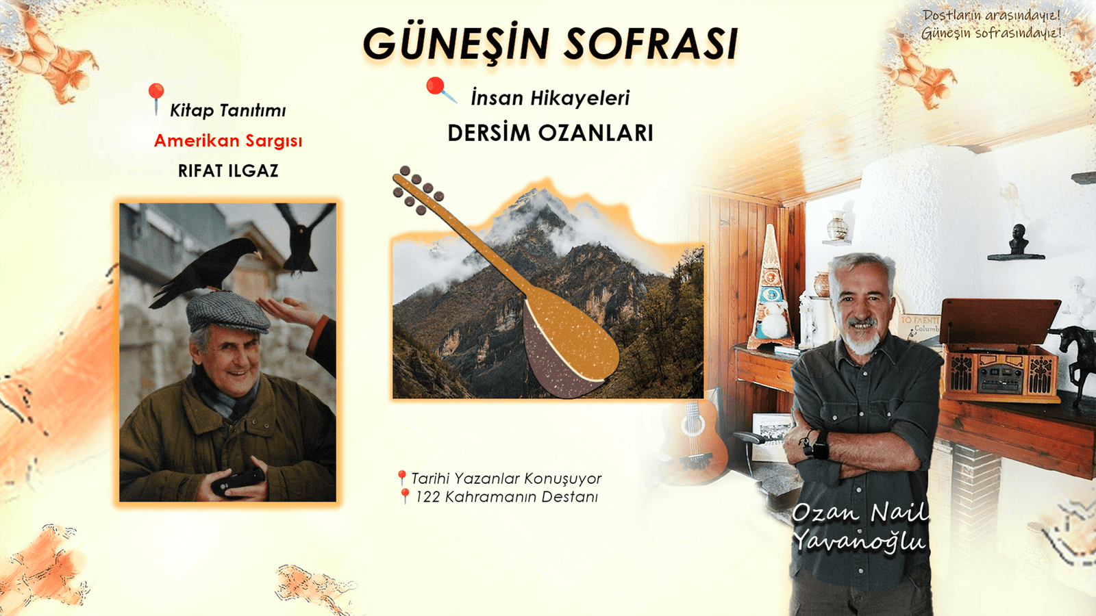 Güneşin Sofrası’nda 5 Aralık Pazar günü yayınlanan, tiyatrodan şiire, belgesel ve kitap tanıtımlarının yer aldığı, insan hikayelerinde Dersim’in halk ozanlarının anlatıldığı, kitap tanıtımlarında ise onurlu aydınlarımızdan, öğretmen, edebiyatçı Fakir Baykurt’un ”Amerikan Sargısı” romanının tanıtıldığı bölümün kaydını paylaşıyoruz.