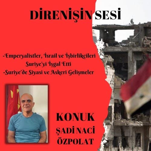 Direnişin Sesi’nde 1 Ocak Çarşamba günü yayınlanan, emperyalistler ve işbirlikçilerinin Suriye işgalini, bölgede yaşanan siyasi ve askeri gelişmeleri konuğumuz Şadi Naci Özpolat ile anlattığımız bölümün kaydını paylaşıyoruz.