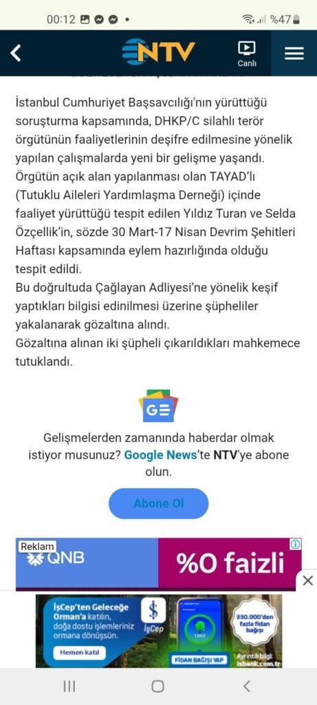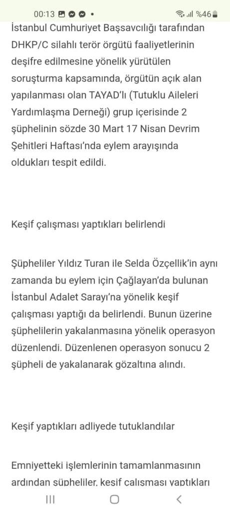 Kuyu tipi hapishanelere karşı adliyede açıklama yapmak isterken gözaltına alınıp bırakıldıktan 3 gün sonra otobüs durağında beklerken kaçırılarak tehdit edilerek göz altına alınıyor planlanmış tutuklanması tutuklanma gerekçesi 15 yıl önceki basın açıklamaları sebebiyle tutuklandı annem polisin “Nurtepe’ye son kez bak,seni silivriye gömeceğiz” dediği 77 yaşındaki Annem için bu haberi yapmaya utanmıyor musunuz?