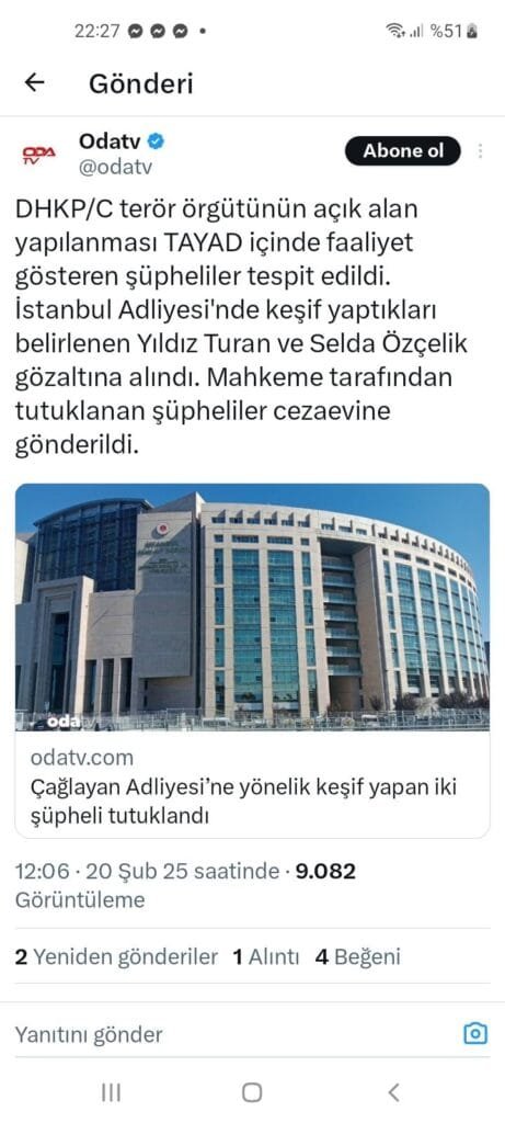Odatv ve Halk TV’nin internet sitelerinde yapılan haberde geçtiğimiz günlerde Nurtepe’de gözaltına alınıp tehdit ve işkencelerle, savcılığa dahi çıkarılmadan tutuklanan iki TAYAD’lı Yıldız Turan ve Selda Özçellik hakkında paylaşılan ve AKP’nin tetikçiliğine denk düşen yalan haberlerine karşılık Halkın Hukuk Bürosu bir açıklama paylaştı.