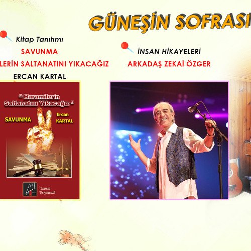 Güneşin Sofrası’nda 9 Mart Pazar günü yayınlanan, tiyatrodan şiire, belgesel ve kitap tanıtımlarının yer aldığı, insan hikayelerinde yıldızlara uğurladığımız Edip Akbayram’ın yer aldığı, kitap tanıtımlarında ise devrimci tutsaklardan Ercan Kartal’ın ”Haramilerin Saltanatını Yıkacağız” isimli kitabın tanıtıldığı bölümün kaydını paylaşıyoruz.