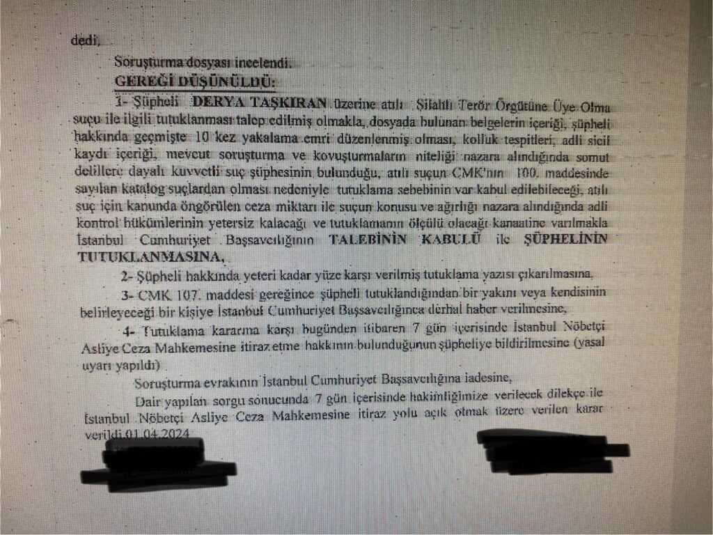 Olayın gerçeği şu şekildedir; müvekkil Derya TAŞKIRAN, kendisini takip eden sivil şahıslar hakkında suç duyurusunda bulunmak ve adli kontrol ile serbest bırakıldığı dosyaya adres bildiriminde bulunmak için adliyeye gelmiş, dilekçe verdikten ve suç duyurusunda bulunduktan sonra adliyeden ayrılmak üzere Çağlayan Adliyesi çıkışına yönelmiştir. Bu sırada halihazırda kendisini takip eden polisler tarafından önü kesilmiş ve kendisinin ifade eksiği olduğu söylenmiştir. Bunun üzerine polis tutanağında yazdığı üzere “direnç” göstermeden polis eşliğinde 7.kata götürülen Derya Taşkıran, başka bir dosyadan tutuklama talebiyle sulh ceza hakimliğine sevk edilmiş ve tutuklanmıştır. Müvekkilin tutuklanma gerekçesinde de görüleceği üzere, ne savcılarla ilgili bir iddia ne de “urgan” söz konusudur.