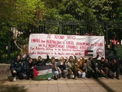 NATO SAVAŞ VE SÖMÜRÜ DEMEKTIR” başlıklı panel açılışı yapıldı ve hem Halk Cephesi hem de Filistin bayrakları dalgalandı. Bir AEC üyesi açıklamamızı okurken, diğerleri bildiri dağıtıyordu. Ayrılmadan önce elçilik arazisine “TESLİM OLMAYANLAR YENİLEMEZ” yazılı bir pankart asıldı.