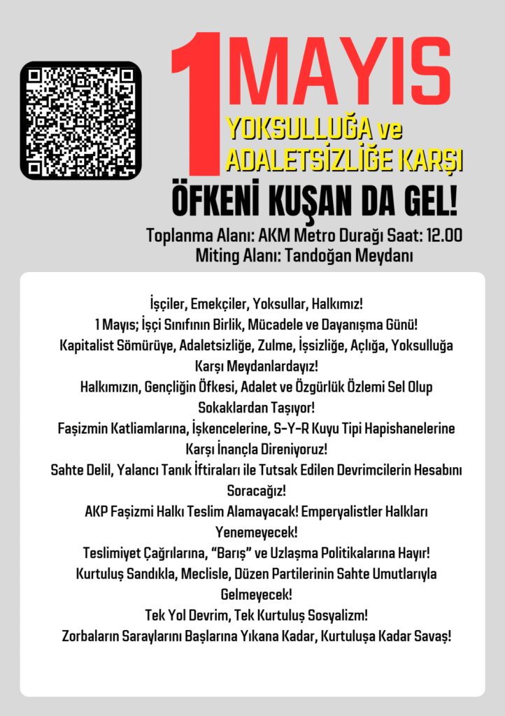 Bugün 1 MAYIS… İşçilerin, emekçilerin birliğinin, mücadelesinin ve dayanışmasının sembolü olan gün. Ve hesap sorma günü… Niğde’de kolunu makineye kaptırıp ölen 14 yaşındaki Abdurrahman Özkul’un, katledilip yakılan ve katilleri mahkemede ödüllendirilen Afgan işçi Muhammed Nourtani’nin, Kayseri’de kum ocağında cesedine 26 saat sonra ulaşılan Mehmet Özarslan’ın hesabını sormak için. Yalnızca bu yılın ilk üç ayında katledilen 447 işçi için… Egemen sınıflar ülkemizi bir adaletsizlik denizine çevirdiler. İtirafçı yalanlarıyla, sahte delillerle onlarca yıl hapsedilen yoldaşlarımız için buradayız. Yoksul halkımız ekmeğe ve adalete doysun diyedir sloganlarımız.