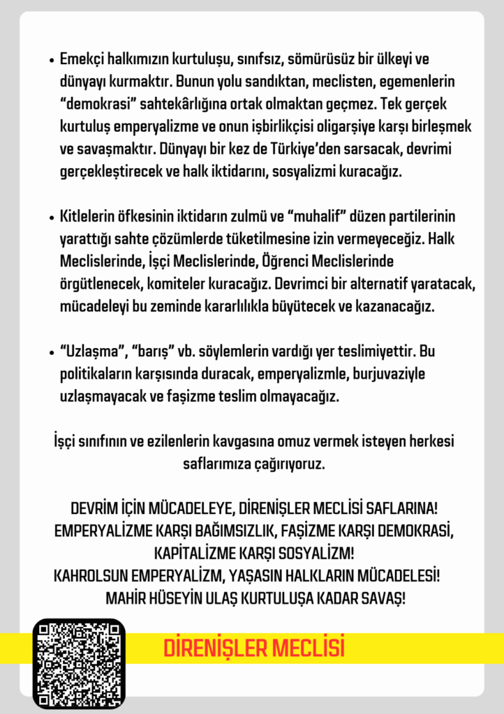 • Emekçi halkımızın kurtuluşu, sınıfsız, sömürüsüz bir ülkeyi ve dünyayı kurmaktır. Bunun yolu sandıktan, meclisten, egemenlerin “demokrasi” sahtekârlığına ortak olmaktan geçmez. Tek gerçek kurtuluş emperyalizme ve onun işbirlikçisi oligarşiye karşı birleşmek ve savaşmaktır. Dünyayı bir kez de Türkiye’den sarsacak, devrimi gerçekleştirecek ve halk iktidarını, sosyalizmi kuracağız.