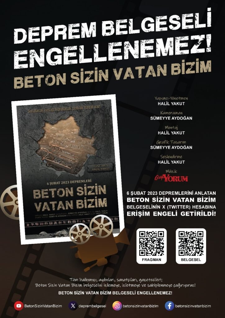6 Şubat 2023 depremlerini anlatan Beton Sizin Vatan Bizim belgeselimizin @deprembelgeseli kullanıcı adlı X (twitter) hesabına fragman gösterilerek erişim engelimiz mevcut ; konularla ilgili basın toplantısı yaparak “Beton Sizin Vatan Bizim belgeseli engellenemez!” demiştik.