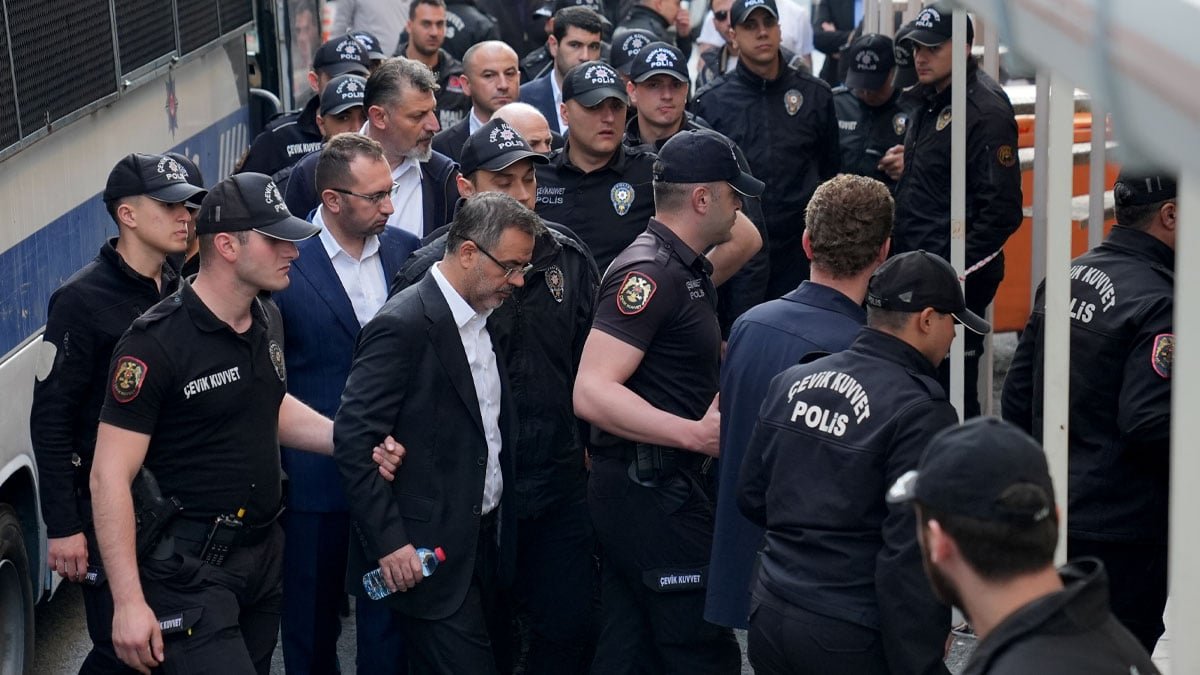 İstanbul Büyükşehir Belediyesi (İBB)’ne yönelik son operasyonda gözaltına alınanlar tek sıraya dizildi, ellerine plastik kelepçeler takıldı, başları öne eğdirildi, kameraların önünde polislerin arasından geçirildiler.