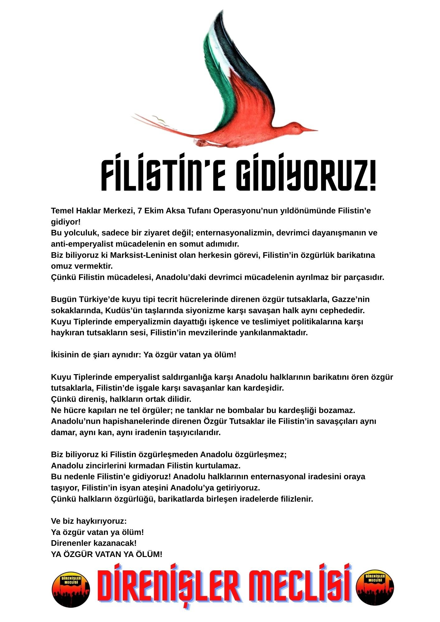 Biz biliyoruz ki Filistin özgürleşmeden Anadolu özgürleşmez; Anadolu zincirlerini kırmadan Filistin kurtulamaz. Bu nedenle Filistin’e gidiyoruz! Anadolu halklarının enternasyonal iradesini oraya taşıyor, Filistin’in isyan ateşini Anadolu’ya getiriyoruz. Çünkü halkların özgürlüğü, barikatlarda birleşen iradelerde filizlenir.
