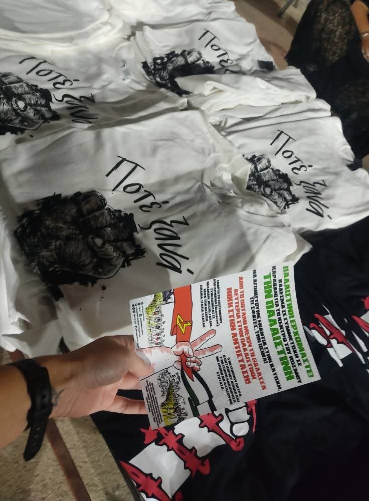 Konstantina Kartsioti, konuşmasına Filistin halkının binlerce şehidine ve Pavlos Fyssas’a saygı duruşuyla başladı. Filistin’e gidiyoruz Kampanyasından, 20 Eylül’de Berlin’den başlayıp Refah sınırı ve Gazze’ye kadar devam edecek olan kervandan bahsetti. Kampanya kapsamında, kervan Filistin’e hareket etmeden önce 5-6-7 Ekim tarihlerinde Yunanistan’da düzenlenecek etkinliklere katılım çağrısı yaptı.