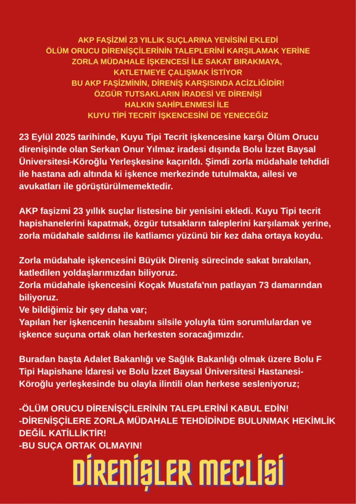 23 Eylül 2025 tarihinde, Kuyu Tipi Tecrit işkencesine karşı Ölüm Orucu direnişinde olan Serkan Onur Yılmaz iradesi dışında Bolu İzzet Baysal Üniversitesi-Köroğlu Yerleşkesine kaçırıldı. Şimdi zorla müdahale tehdidi ile hastana adı altında ki işkence merkezinde tutulmakta, ailesi ve avukatları ile görüştürülmemektedir.