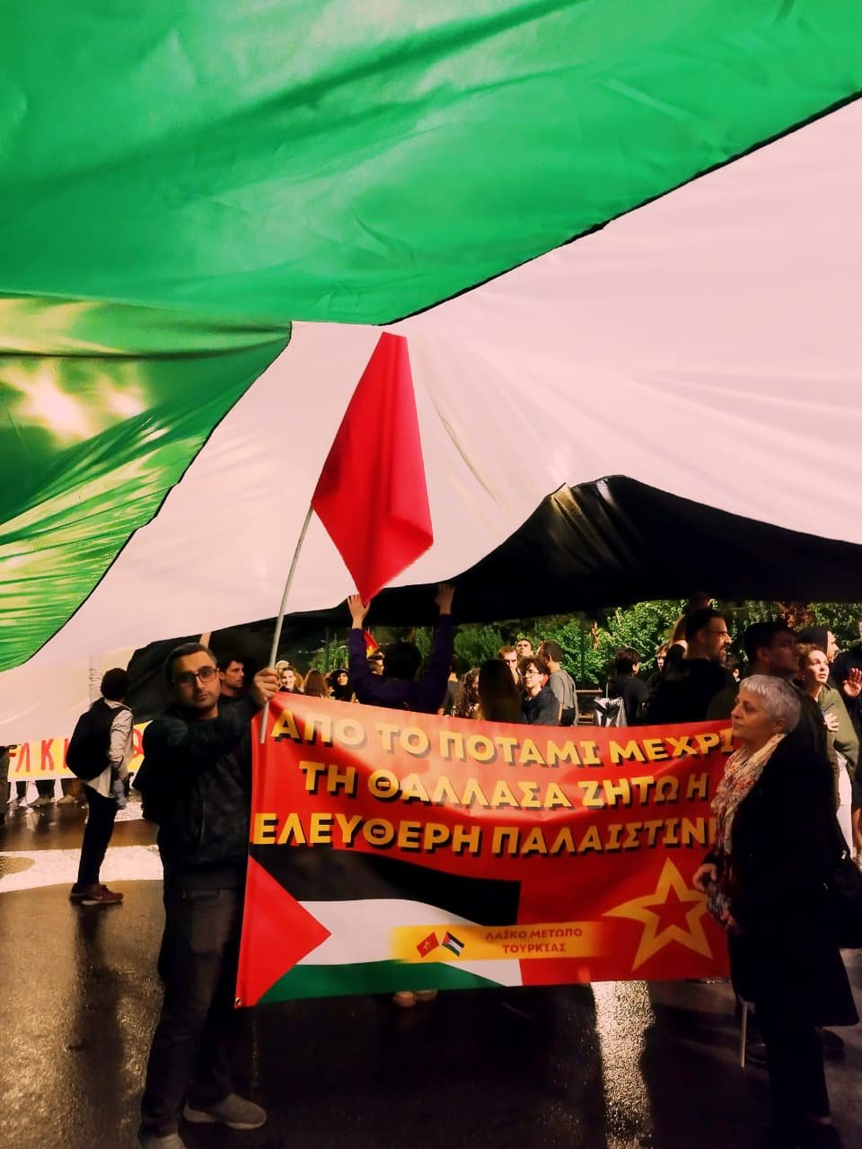 Birçok sol örgüt ve partinin katıldığı eylemde, Yunanistan Halk Cepheliler ‘’Nehirden Denize Özgür Filistin’’ pankartıyla yürüyüşte yerlerini aldılar. Halk Cepheliler, ‘’Katil İsrail Filistin’den Defol’’, ‘’Katil ABD Ortadoğu’dan Defol’’, ‘’Mahir Hüseyin Ulaş Kurtuluşa Kadar Savaş’’ ve ‘’Kurtuluş Kavgada Zafer Cephede’’ sloganlarıyla yürüdüler.