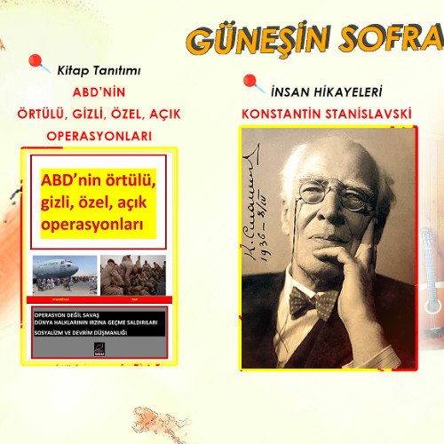 Güneşin Sofrası’nda, 19 Ekim Pazar günü yayınlanan, insan hikayelerinde tiyatro sanatçısı Konstantin Stanislavski’yi anlatıldığı, kitap tanıtımlarında ”ABD’nin Örtülü-Gizli-Özel-Açık Operasyonları” kitabının tanıtıldığı bölümün kaydını paylaşıyoruz.