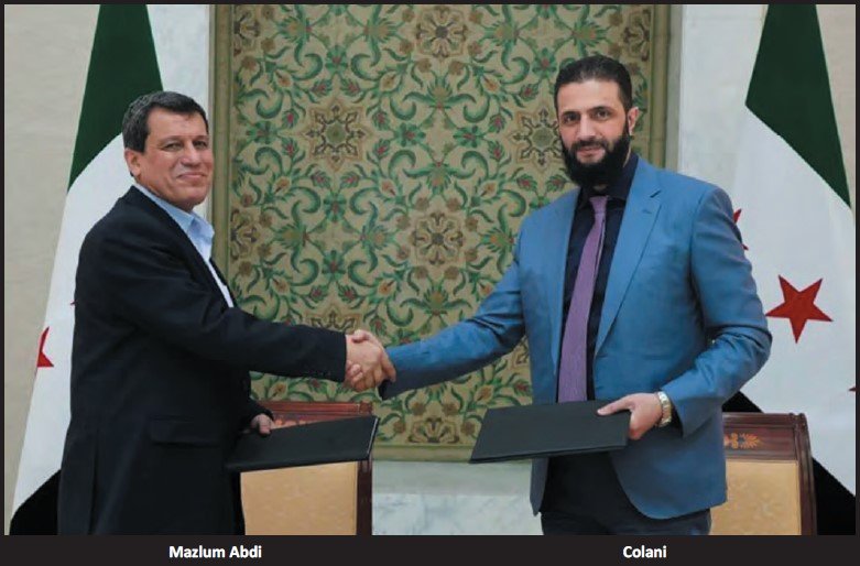 SDG Suriye’nin petrol bakımından en zengin topraklarını ABD emperyalizmi adına elinde tutuyor, emperyalizmin paralı askerliğini yapıyor. Gelinen aşamada emperyalizm SDG ve HTŞ’yi masaya oturtup anlaşma imzalattı. İşbirlikçi Suriye tarafından yapılan açıklamaya göre sekiz maddelik anlaşmada; SDG’nin kontrolündeki tüm sivil ve askeri kurumların yanı sıra petrol ve doğalgaz sahalarının da Şam yönetimine devredileceği belirtildi. Mazlum Abdi yapılan anlaşma için Suriye’nin inşasında gerçek bir fırsat açıklaması yaptı.