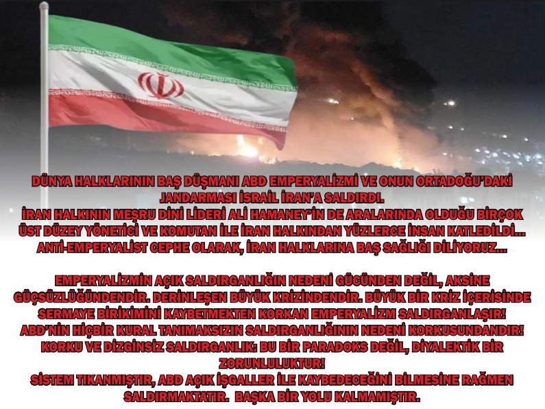 ANTİ-EMPERYALİST CEPHE OLARAK, İRAN HALKININ ABD EMPERYALİZMİNE VE SİYONİST İSRAİL’E KARŞI SÜRDÜRDÜĞÜ VE SÜRDÜRECEĞİ HER TÜRLÜ DİRENİŞİN YANINDAYIZ.