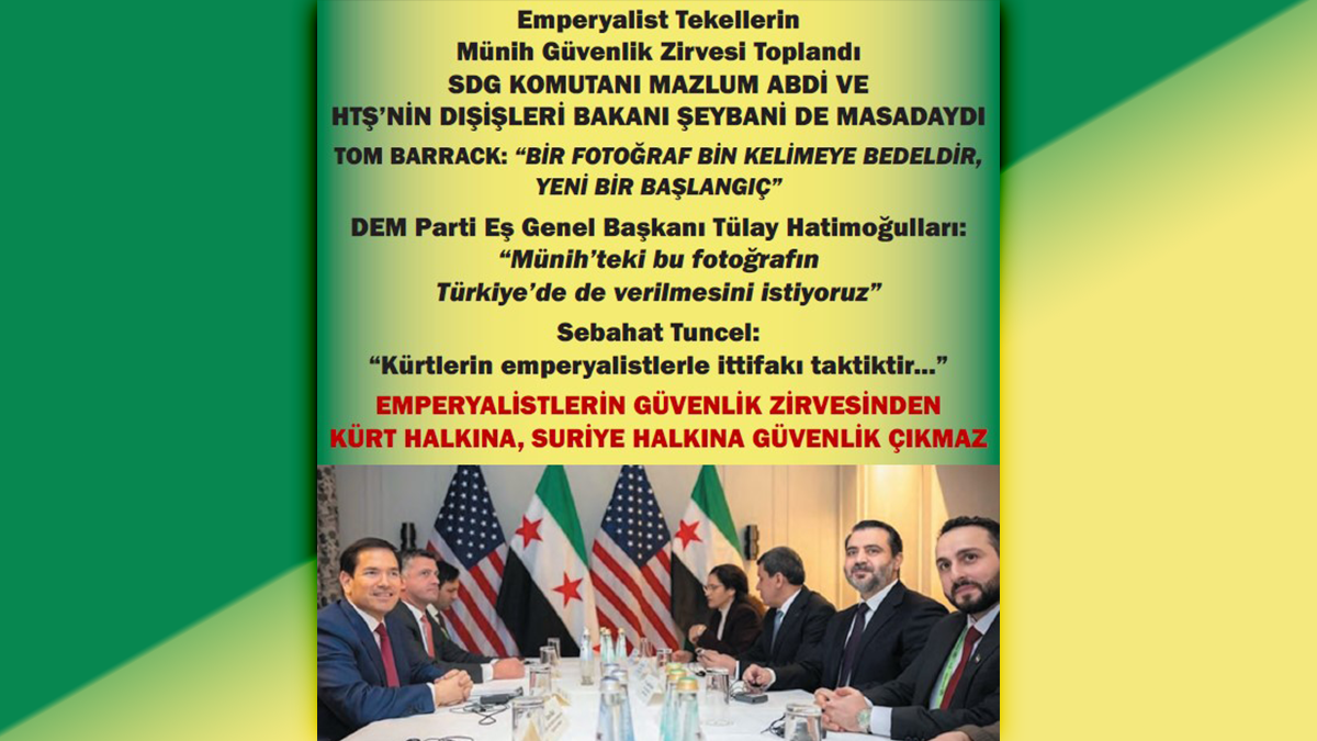 Yukarıdaki fotoğrafa gelince; ne Kürt halkı için ne de Suriye halkları için hiçbir kazanç yoktur. O fotoğrafta Kürt halkının, Suriye halklarının ABD’nin, İsrail’in, AB emperyalistlerinin çıkarları için kullanılması vardır. Münih Konferansı’ndaki binlerce kelimenin anlatamayacağı o fotoğraf, Kürt, Arap, Türkmen, Çerkez, Ermeni… bütün olarak Suriye halklarının ABD hegemonyası için nasıl kullanıldığının fotoğrafıdır. Nasıl köleleştirildiğinin, nasıl işbirlikçileştirildiğinin resmidir.
