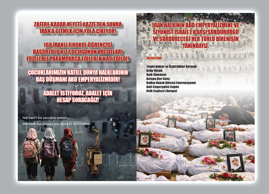 Onlar; hayalleri olan, minik elleriyle kalem tutan, sırtlarında okul çantalarıyla okula giden 6 ila 12 yaş arasındaki 168 kız çocuğuydu. Çantaları ve başörtüleri 28 Şubat 2026 günü ABD ve İsrail tarafından kana bulandı. Bu katliamı tüm dünya halklarına anlatacağız, unutturmayacağız! Yapılması gereken, ADALET istemektir. Adalet mücadelesi, direnip mücadele etmeden kazanılamaz.